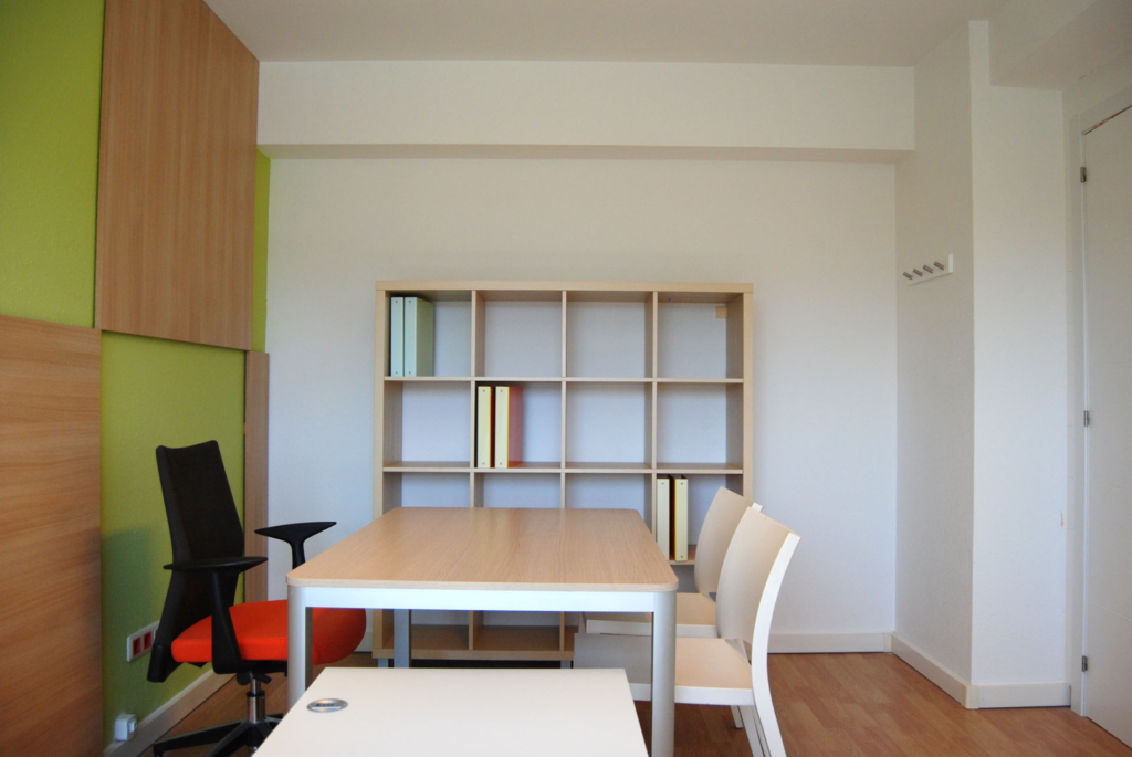 2 mesa/s de trabajo de 1,60 x 1,60 m. buc con archivador y cajón, armario estantería , silla giratoria, silla/s confidente, luz en el techo, cortinas, 3 puntos de toma de corriente (mínimo), línea telefónica VOIP con conexión FIBRA asimétrica, tarifa plana, y terminal de teléfono.